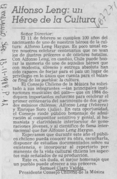 Alfonso Leng: un héroe de la cultura [artículo] Samuel Claro Valdés.