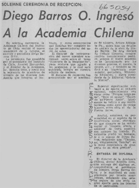 Diego Barros O. ingresó a la Academia Chilena. [artículo]