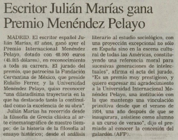 Escritor Julián Marías gana Premio Menéndez Pelayo [artículo]