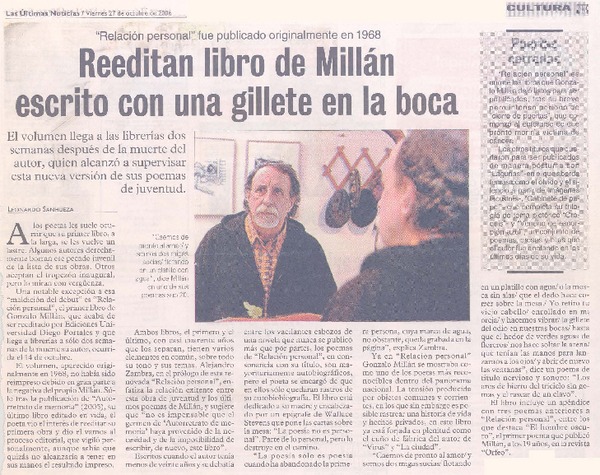 "Relación personal" fue publicado originalmente en 1968 : reeditan libro de Millán escrito con una gillete en la boca [artículo] Leonardo Sanhueza.