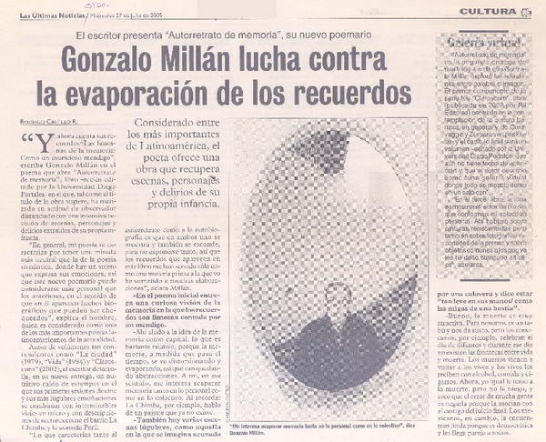 El escritor presenta "Autorretrato de memoria, su nuevo poemario Gonzalo Millán lucha contra la evaporación de los recuerdos [artículo] : Rodrigo Castillo R.