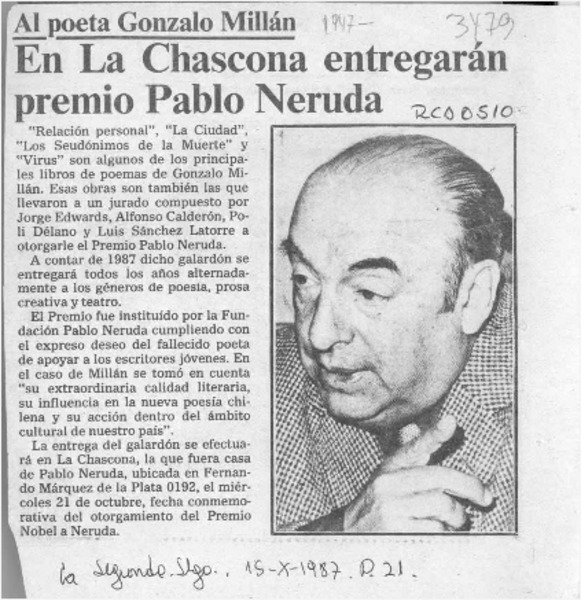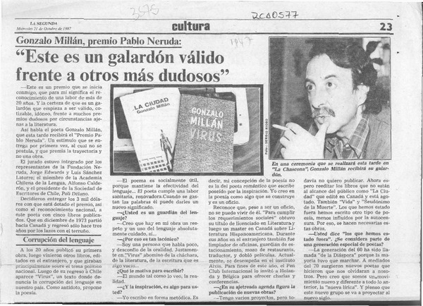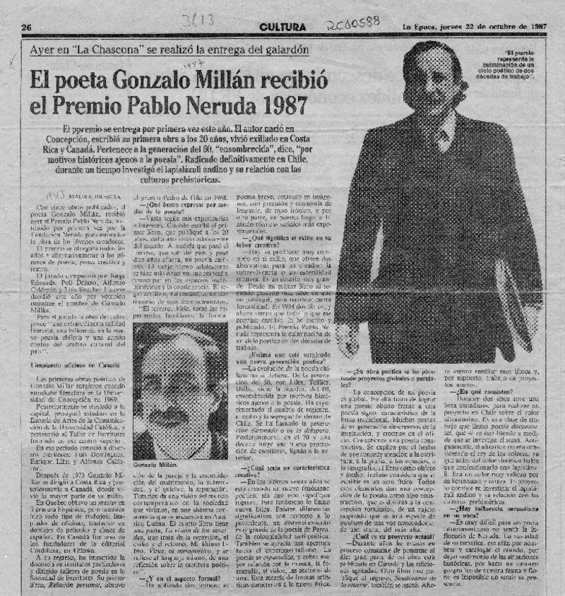El poeta Gonzalo Millán recibió el premio Pablo Neruda 1987 [entrevista] [artículo] : Maura Brescia.
