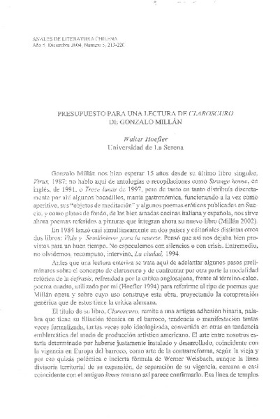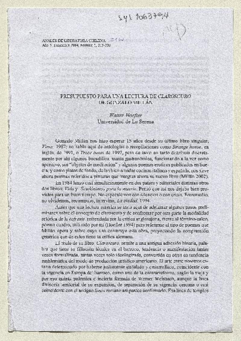 Presupuesto para una lectura de Claroscuro de Gonzalo Millán [artículo] Walter Hoefler.