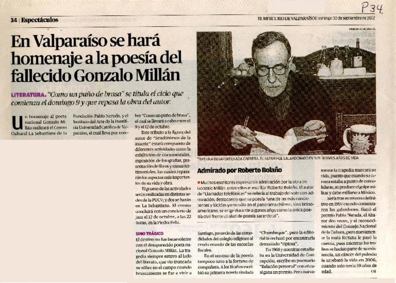 En Valparaíso se hará homenaje a la poesía del fallecido Gonzalo Millán. [artículo]