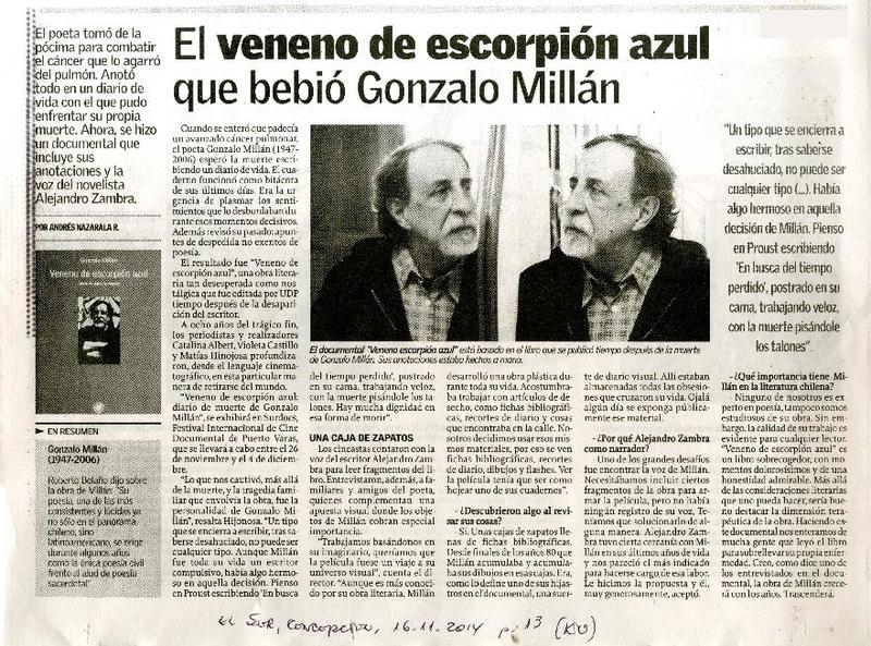 El veneno de escorpión azul que bebió Gonzalo Millán [artículo] Andrés Nazarala R.