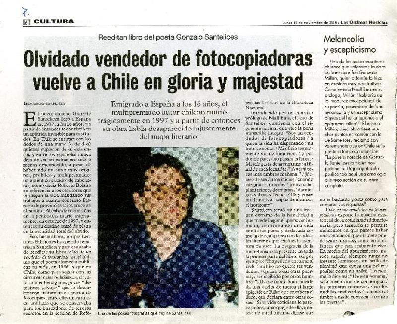 Olvidado vendedor de fotocopiadoras vuelve a Chile en gloria y majestad [artículo] Leonardo Sanhueza.