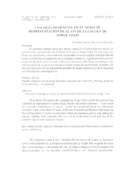 Analogía demencial en el modo de representación de El fin de la locura de Jorge Volpi [artículo] Carolina Andrea Navarrete González.