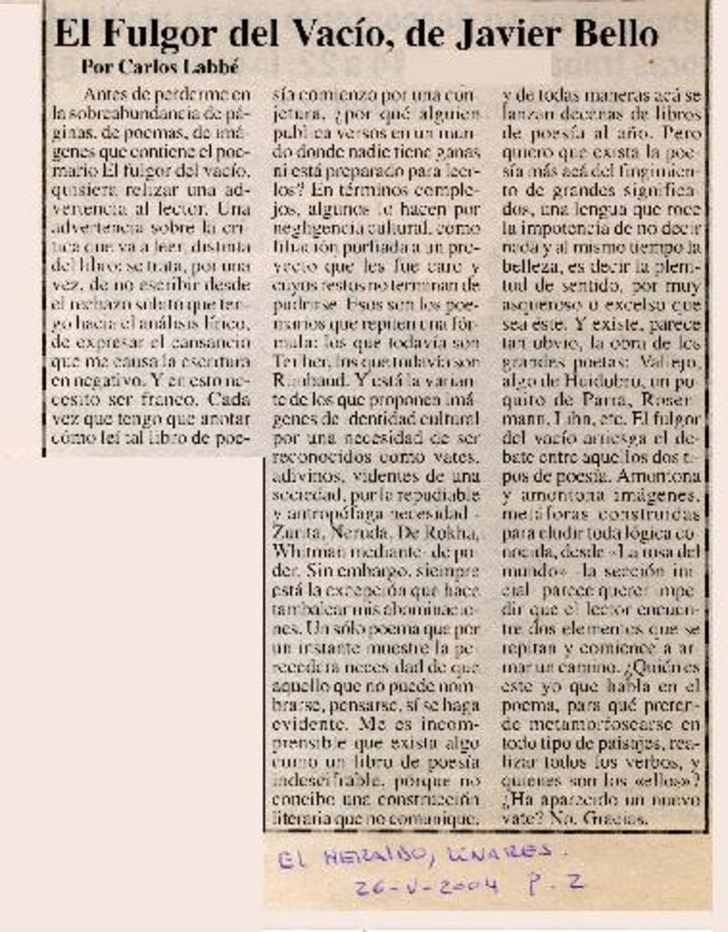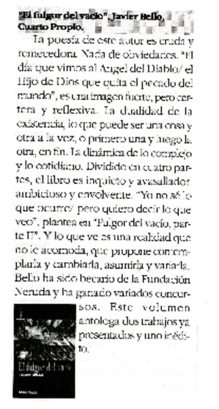 El fulgor del vacío, de Javier Bello [artículo] Carlos Labbé.