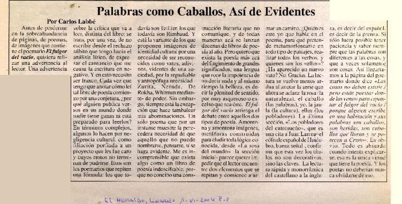 Palabras como caballos, así de evidentes [artículo] Carlos Labbé.