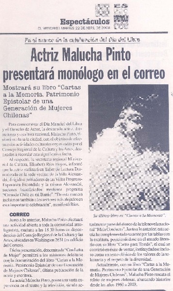 Actriz Malucha Pinto presentará monólogo en el correo [artículo].