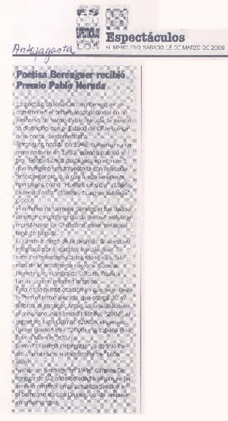Poetisa Berenguer recibió Premio Pablo Neruda [artículo].