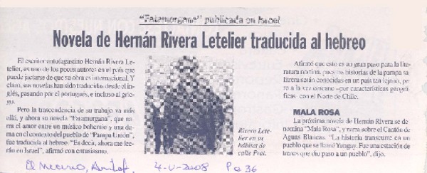 Novela de Hernán Rivera Letelier traducida al hebreo [artículo].