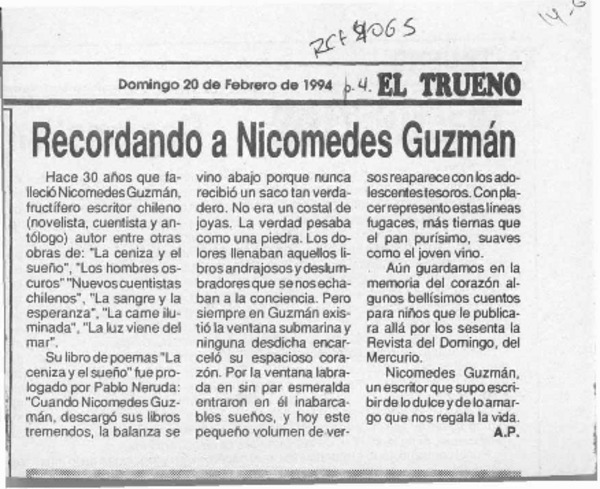 Recordando a Nicomedes Guzmán [artículo] A. P.