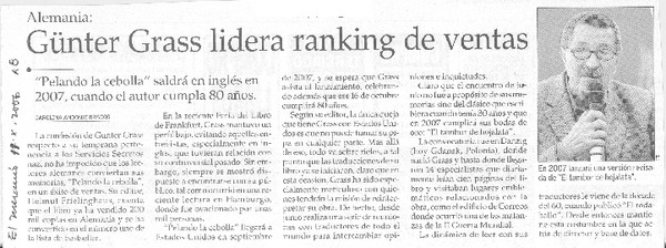 Günter Grass lidera ranking de ventas [artículo] Carolina Andonie Dracos.