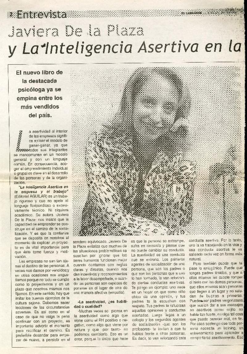 Javiera de la Plaza "En una sociedad asertiva seríamos más felices" (entrevista) [artículo].