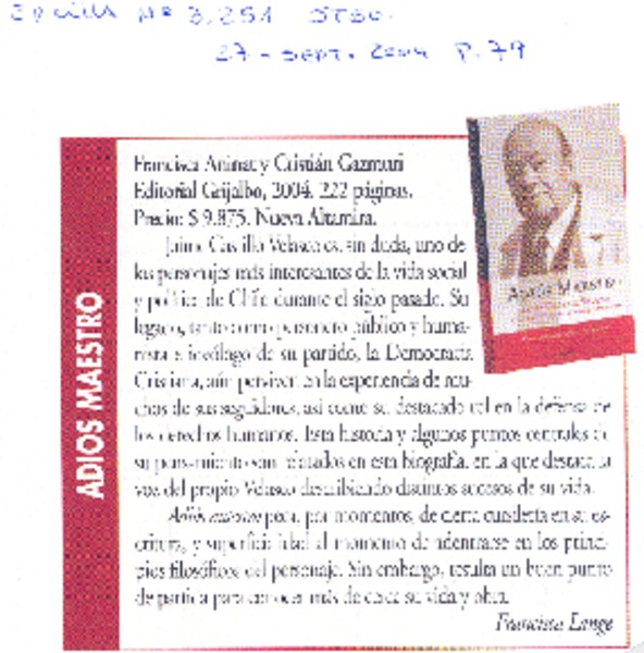 Autores chilenos - Aninat, Francisca - Castillo Velasco, Jaime - Gazmuri, Cristián - Adiós maestro
