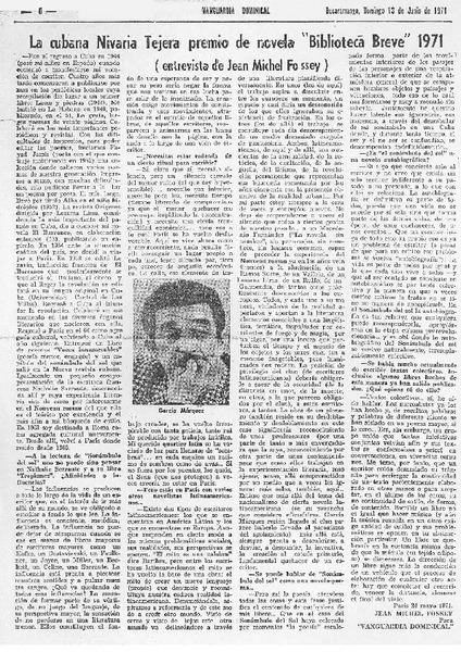 La cubana Nivaria Tejera premio de novela "Biblioteca Breve" 1971 (entrevista) [artículo] Jean Miche Fossey.