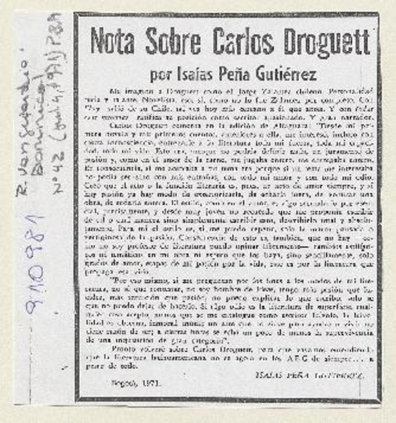 Nota sobre Carlos Droguett [artículo] Isaías Peña Gutiérrez.