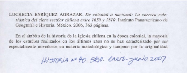 Autores chilenos - Enríquez Agrazar, Lucrecia - De colonial a nacional: La carrera eclesiástica del clero secular chilena entre 1650 y 1810