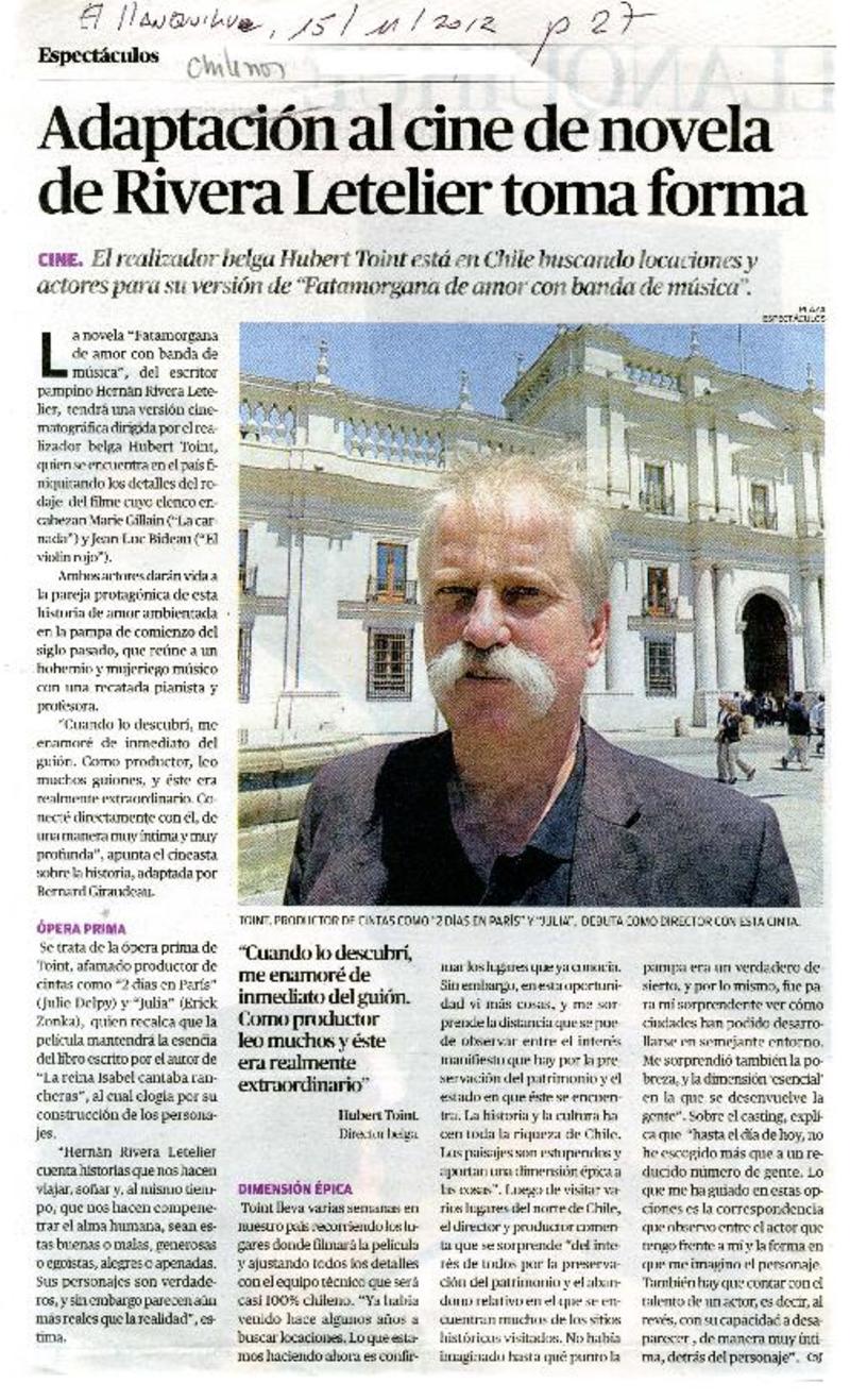 Adaptación al cine de novela de Rivera Letelier toma forma. [artículo].