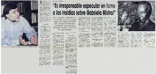 "Es irresponsable especular en torno a las insidias sobre Gabriela Mistral" [entrevistas] [artículo] : Mario Rodríguez Ordenes.