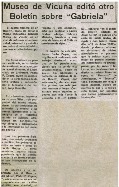 Museo de Vicuña editó otro boletín sobre "Gabriela". [artículo]