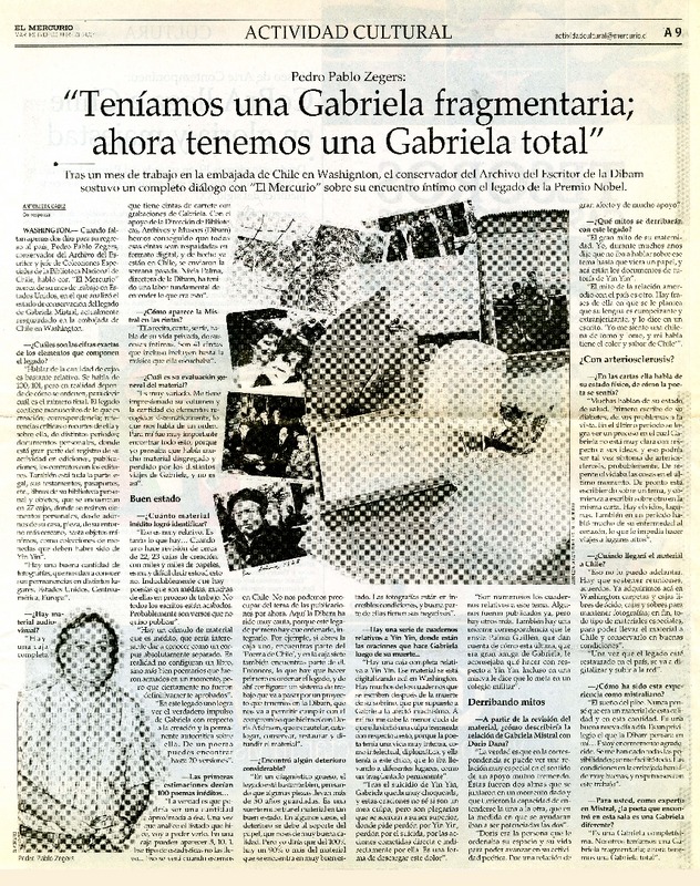 "Teníamos una Gabriela fragmentaria; ahora tenemos una Gabriela total" (entrevista) [artículo] Antonieta Cádiz.