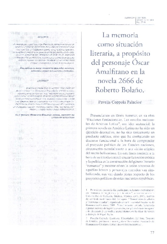 La memoria como situación literaria, a propósito del personaje Óscar Amalfitano en la novela 2666 de Roberto Bolaño [artículo] Pavella Coppola Palacios.