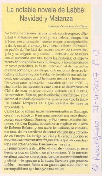 La notable novela de Labbé: Navidad y Matanza [artículo]Esteban Valenzuela Van Treek.