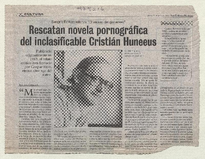 Rescatan novela pronográfica del inclasificable Cristián Huneeus [artículo] Rodrigo Castillo R.