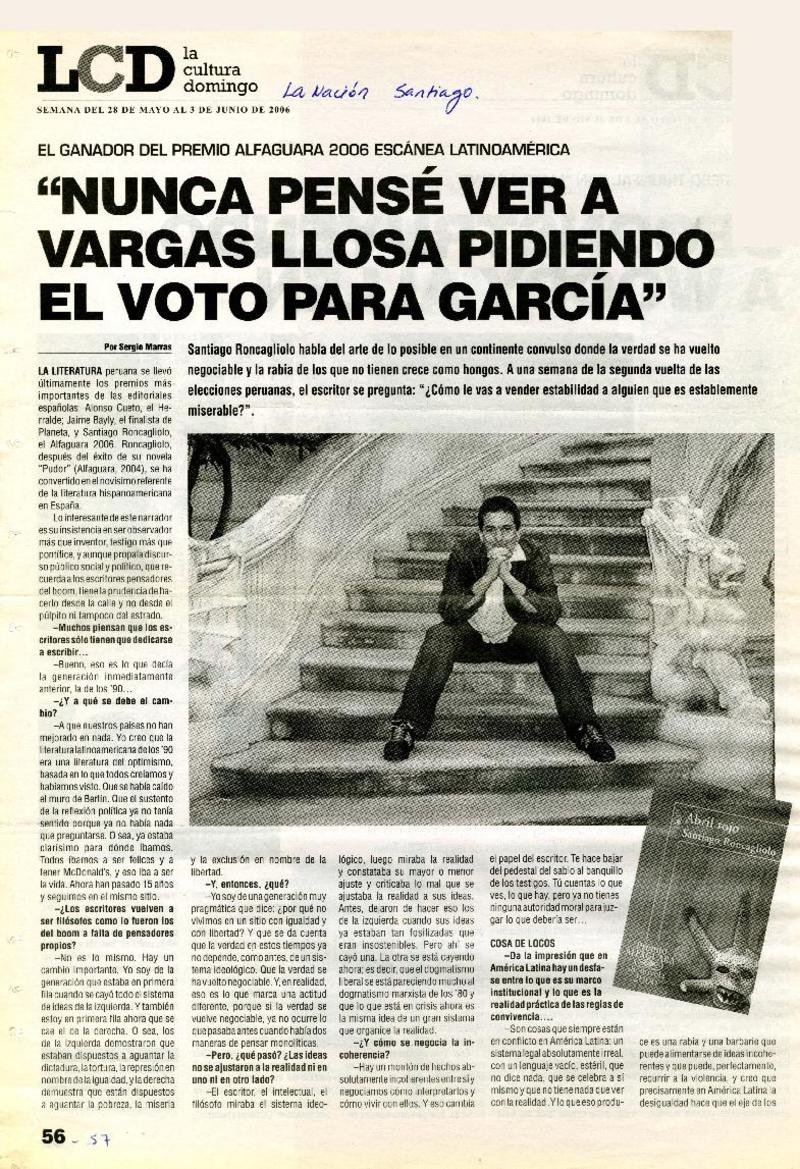 "Nunca pensé ver a Vargas Llosa pidiendo el voto para García" (entrevista) [artículo]Sergio Marras.