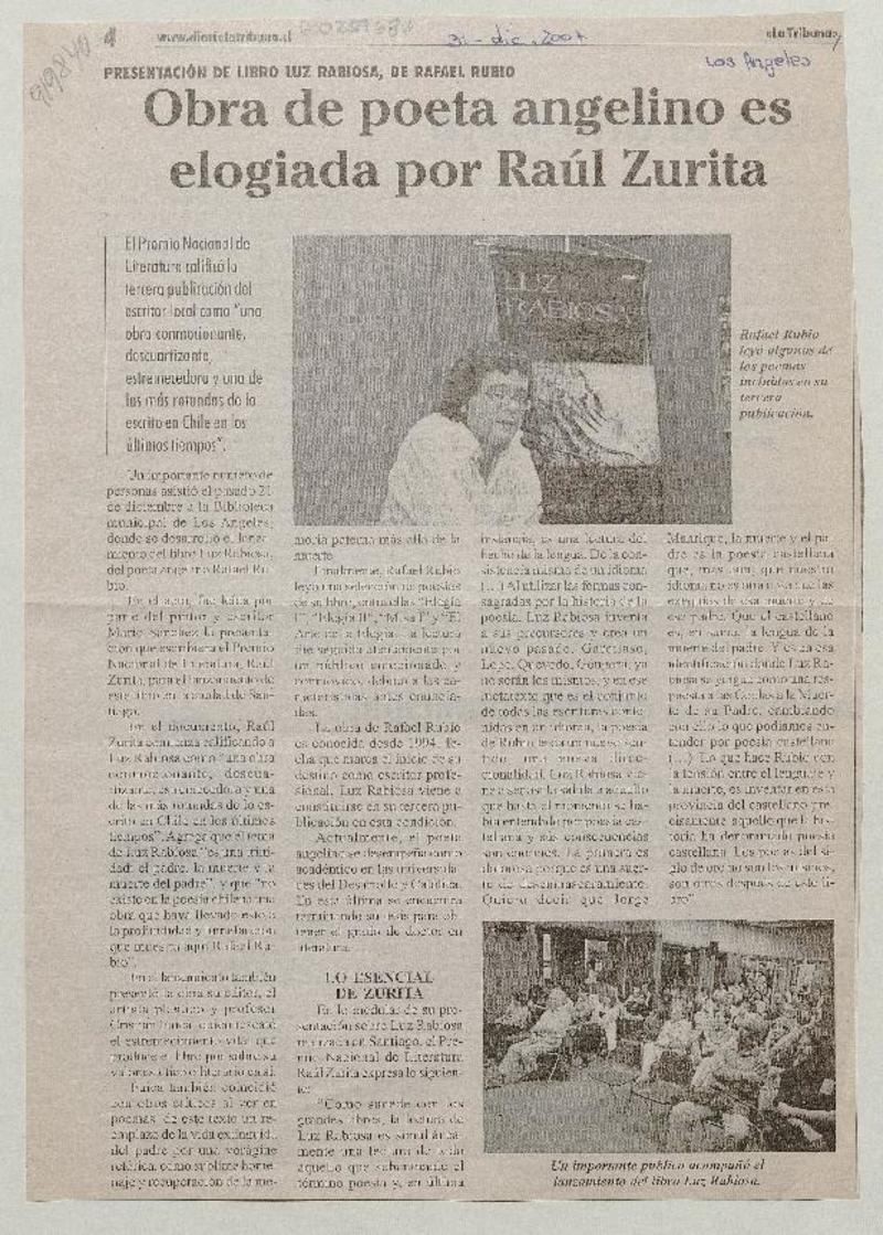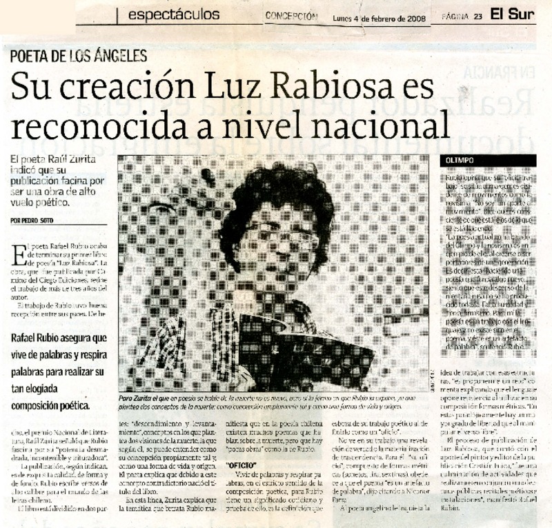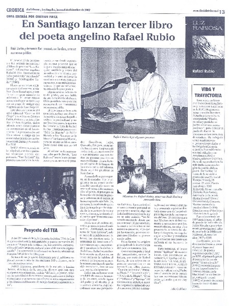 En Santiago lanzan tercer libro del poeta angelino Rafael Rubio [artículo] Julio Cid Báez.