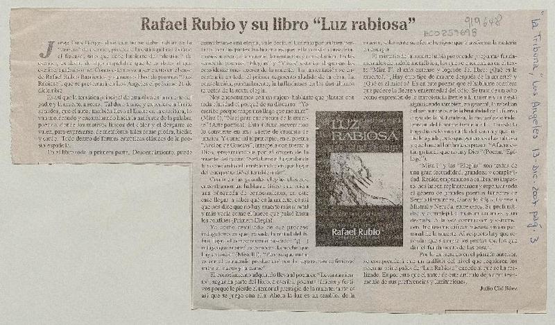 Rafael Rubio y su libro "Luz rabiosa" [artículo]Julio Cid Báez.