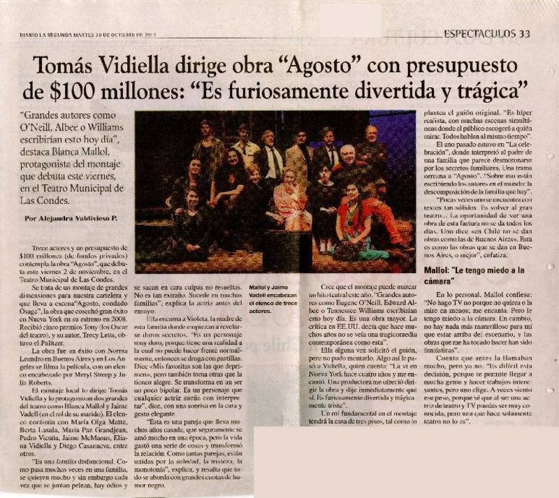 Tomás Vidiella dirige obra "Agosto" con presupuesto de $100 millones: "Es furiosamente divertida y trágica". [artículo] Alejandra Valdivieso P.