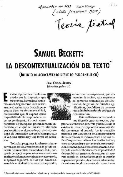 Samuel Beckett: la descontextualización del texto [artículo] Jaime Coloma Andrew.