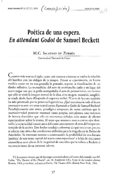 Poética de una espera. En attendant Godot de Samuel Beckett [artículo] M. C. Salantino de Zubiría.