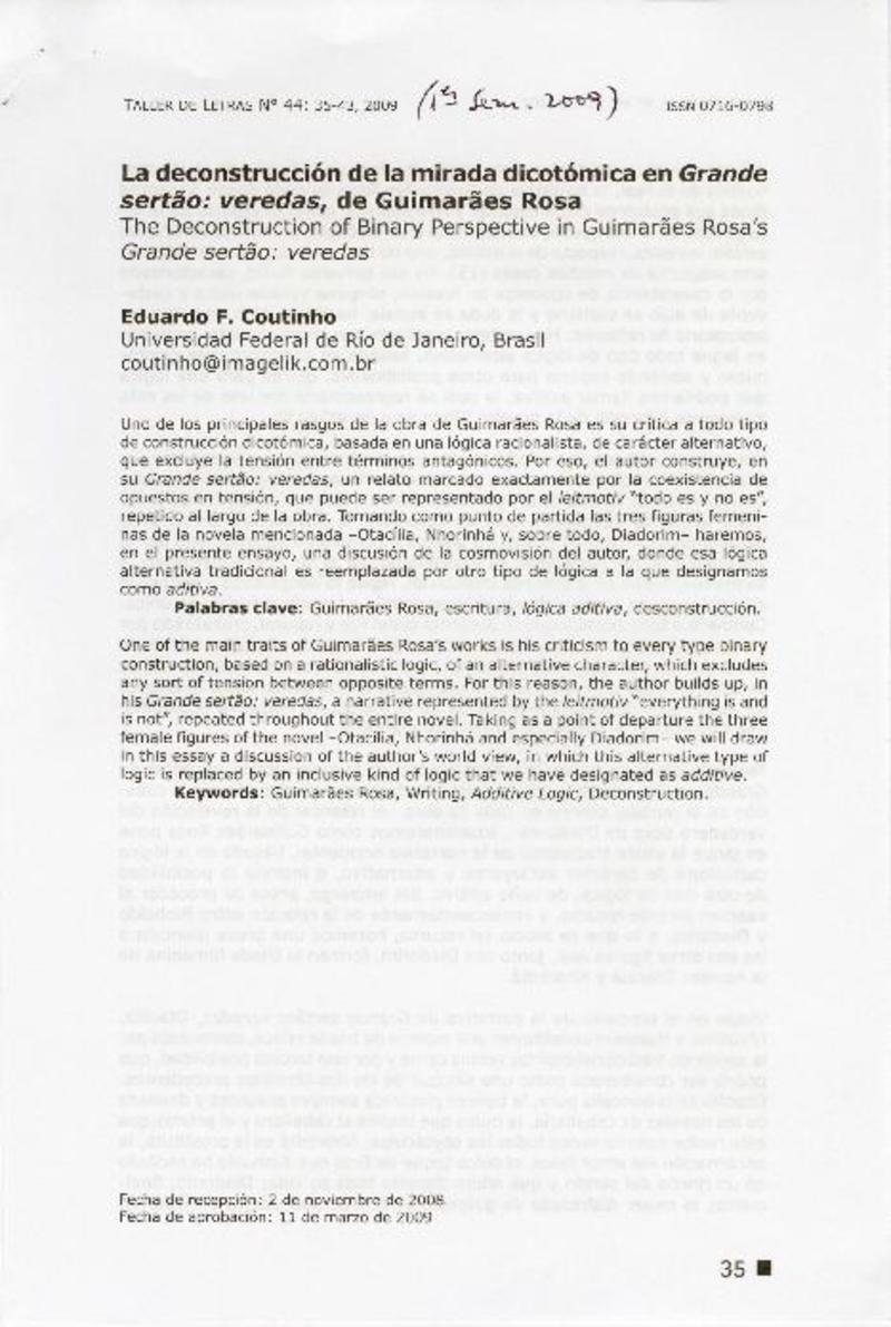 La deconstrucción de la mirada dicotómica en grande sertão : veredas, de Guimarães Rosa [artículo] Eduardo F. Coutinho.