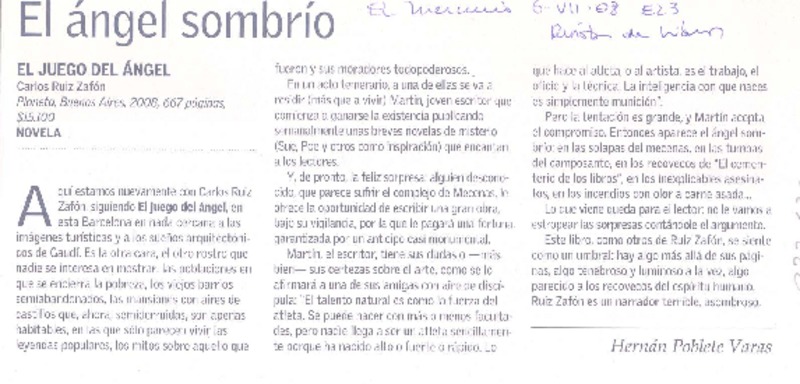 El ángel sombrío [artículo] Hernán Poblete Varas.