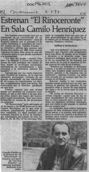 Estrenan "El rinoceronte" en sala Camilo Henríquez" [artículo].
