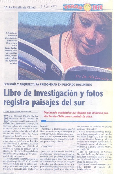 Libro de investigación y fotos registra paisajes del sur [artículo] Rodolfo Hlousek Astudillo.