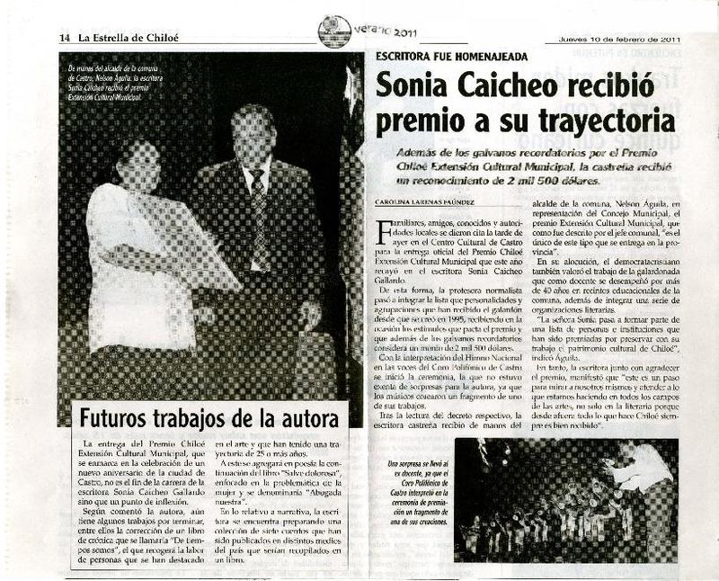 Sonia Caicheo recibió premio a su trayectoria [artículo] Carolina Larenas Faúndez.
