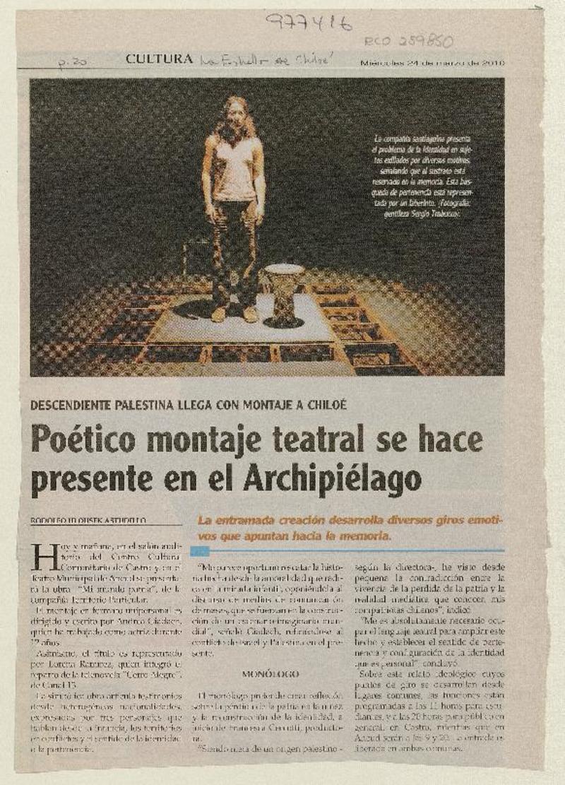 Poético montaje teatral se hace presente en el Archipiélago [artículo] Rodolfo Hlousek Astudillo.