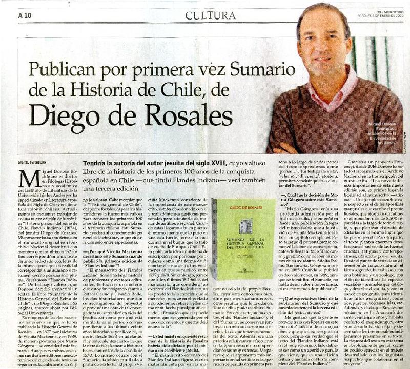 Publican por primera vez Sumario de la Historia de Chile, de Diego de Rosales Daniel Swinburn. [artículo]