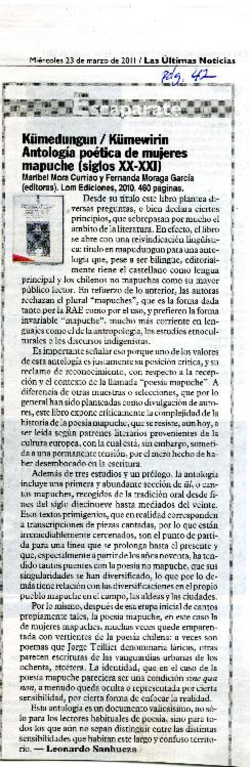 Antología poética de mujeres mapuche (siglos XX-XXI) [artículo] Leonardo Sanhueza.