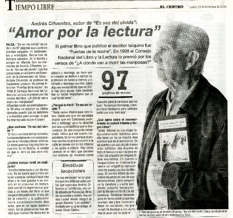 Autores chilenos - Entrevistas - En vez del olvido - Cifuentes R., Andrés