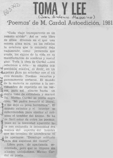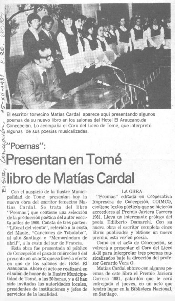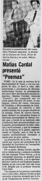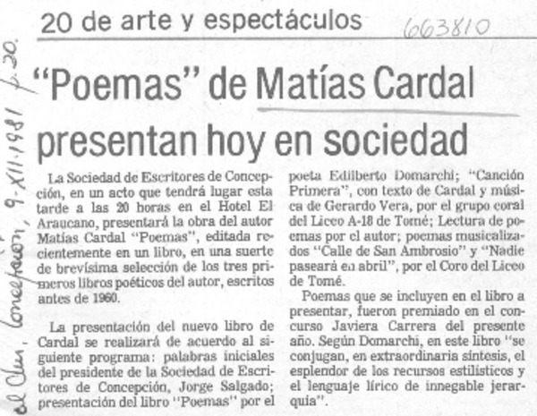 "Poemas" de Matías Cardal presentan hoy en sociedad. [artículo]