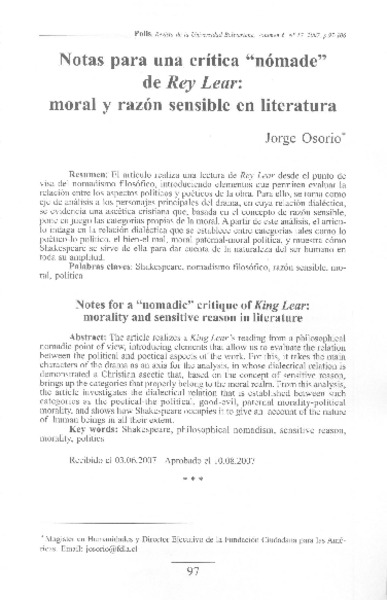 Notas para una crítica "nómade" de Rey Lear: moral y razón sensible en literatura [artículo] Jorge Osorio.