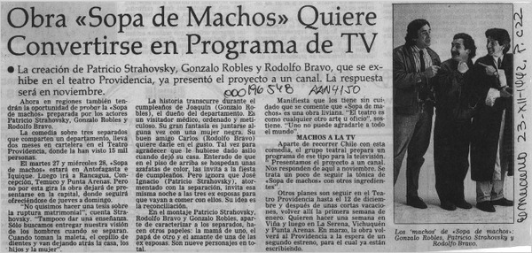Obra "Sopa de machos" quiere convertirse en programa de TV [artículo].