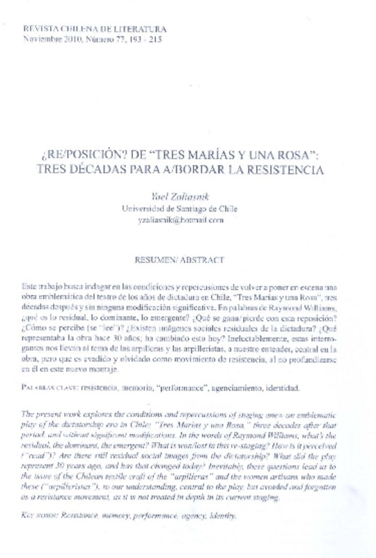 "Tres Marías y una Rosa" es una obra muy vigente [artículo] Sergio Ramón Fuentealba.