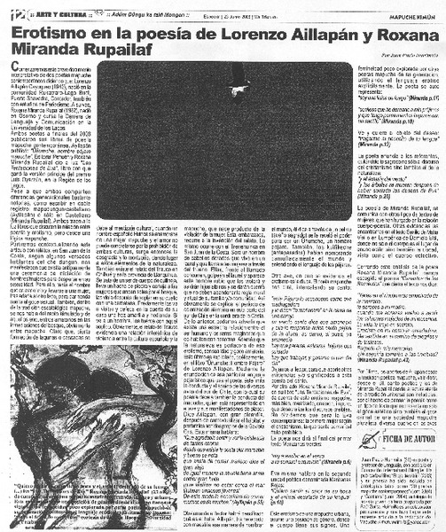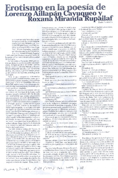 Erotismo en la poesía de Lorenzo Aillapán Cayuqueo y Roxana Miranda Ruapilaf [artículo] Paulo Huirimilla.